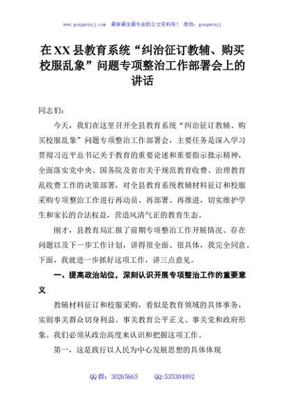 / 在县教育系统“纠治征订教辅、购买校服乱象”问题专项整治工作部署会上的讲话