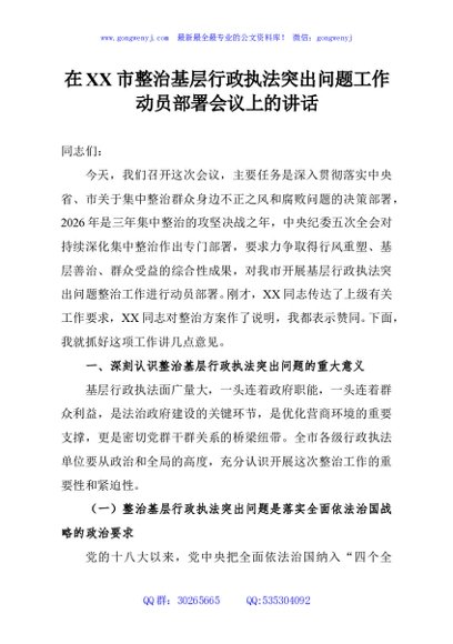 / 在XX市整治基层行政执法突出问题工作动员部署会议上的讲话