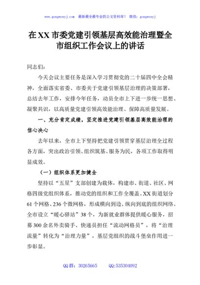 / 在XX市委党建引领基层高效能治理暨全市组织工作会议上的讲话