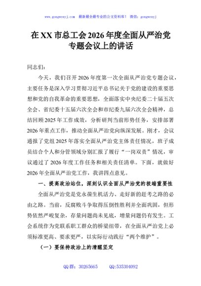 / 在XX市总工会2026年度全面从严治党专题会议上的讲话