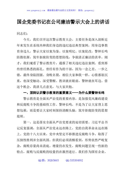 / 国企党委书记在公司廉洁警示大会上的讲话