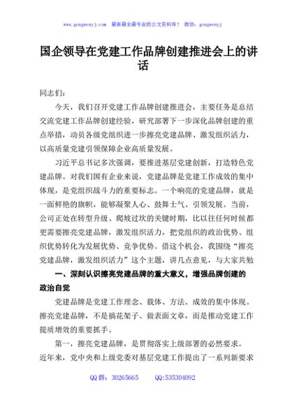 / 国企领导在党建工作品牌创建推进会上的讲话