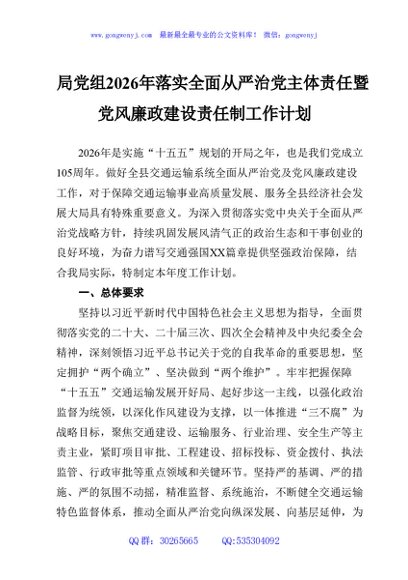 / 局党组2026年落实全面从严治党主体责任暨党风廉政建设责任制工作计划