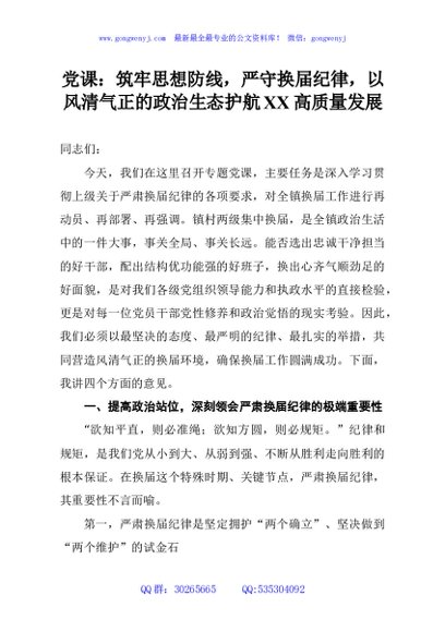 / 党课:筑牢思想防线,严守换届纪律,以风清气正的政治生态护航XX高质量发展