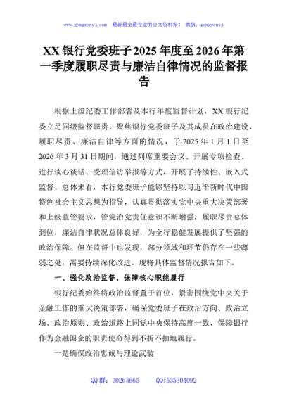 / 银行党委班子2025年度至2026年第一季度履职尽责与廉洁自律情况的监督报告