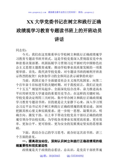 / 大学党委书记在树立和践行正确学习教育专题读书班上的开班动员讲话