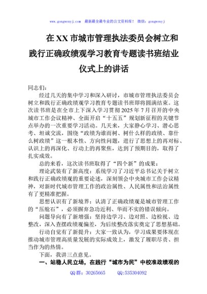 / 在市城市管理执法委员会树立和践行正确学习教育专题读书班结业仪式上的讲话