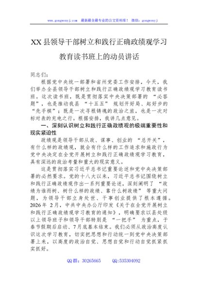 / 县领导干部树立和践行正确学习教育读书班上的动员讲话