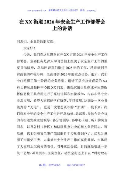 / 在XX街道2026年安全生产工作部署会上的讲话