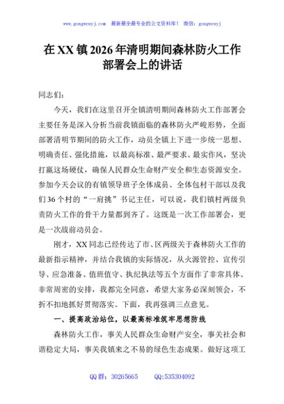 / 在XX镇2026年清明期间森林防火工作部署会上的讲话