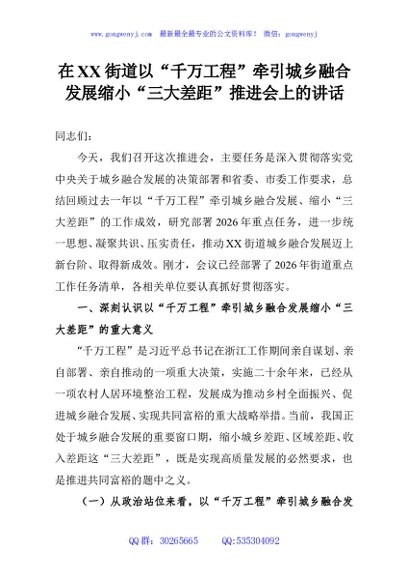 / 在XX街道以“千万工程”牵引城乡融合发展缩小“三大差距”推进会上的讲话