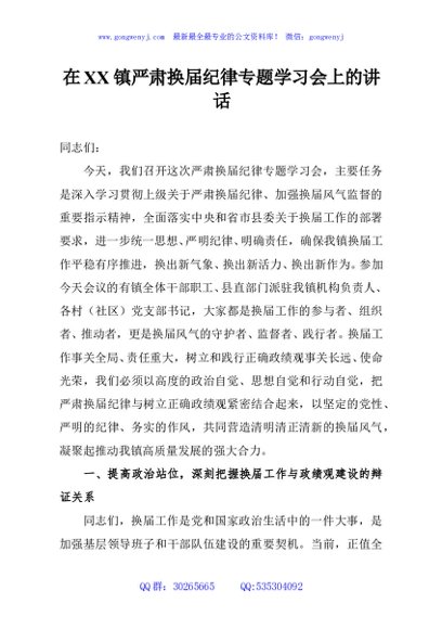 / 在XX镇严肃换届纪律专题学习会上的讲话