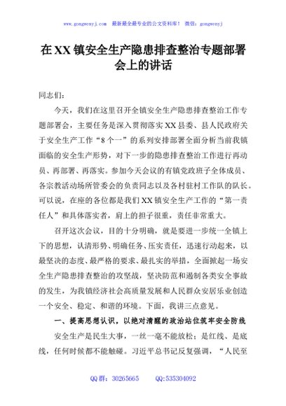 / 在XX镇安全生产隐患排查整治专题部署会上的讲话