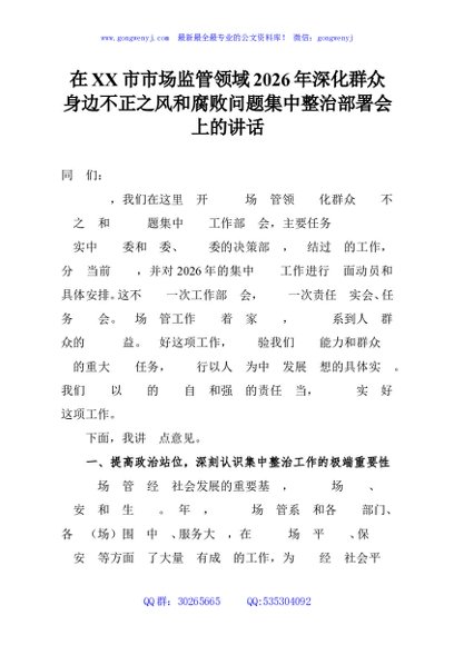 / 在XX市市场监管领域2026年深化群众身边不正之风和腐败问题集中整治部署会上的讲话