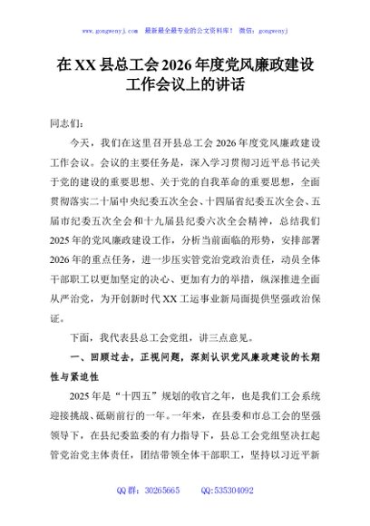 / 在XX县总工会2026年度党风廉政建设工作会议上的讲话