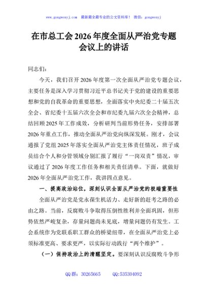/ 在市总工会2026年度全面从严治党专题会议上的讲话