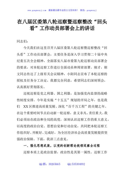 / 在八届区委第八轮巡察暨巡察整改“回头看”工作动员部署会上的讲话