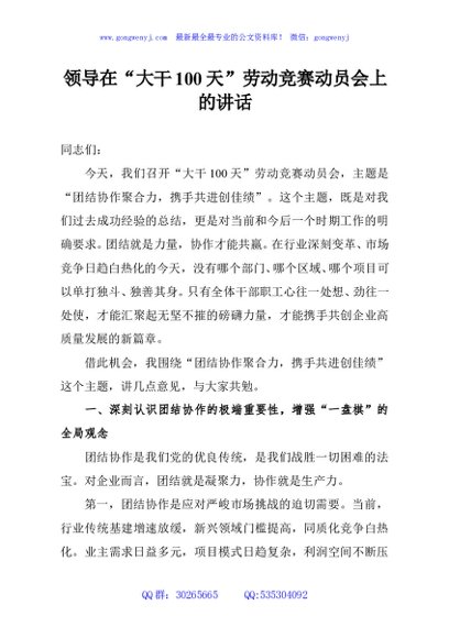 / 领导在“大干100天”劳动竞赛动员会上的讲话