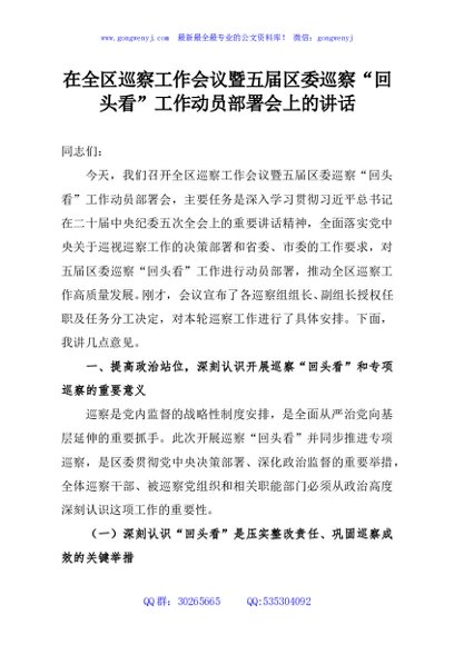 / 在全区巡察工作会议暨五届区委巡察“回头看”工作动员部署会上的讲话