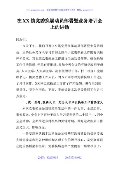 / 在XX镇党委换届动员部署暨业务培训会上的讲话