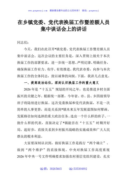 / 在乡镇党委、党代表换届工作暨差额人员集中谈话会上的讲话