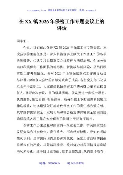 / 在XX镇2026年保密工作专题会议上的讲话