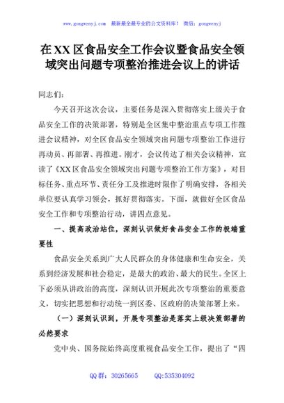 / 在XX区食品安全工作会议暨食品安全领域突出问题专项整治推进会议上的讲话