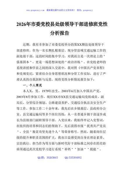 / 2026年市委党校县处级领导干部进修班党性分析报告