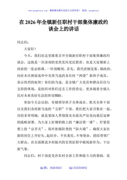 / 在2026年全镇新任职村干部集体廉政约谈会上的讲话