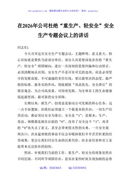 / 在2026年公司杜绝“重生产、轻安全”安全生产专题会议上的讲话