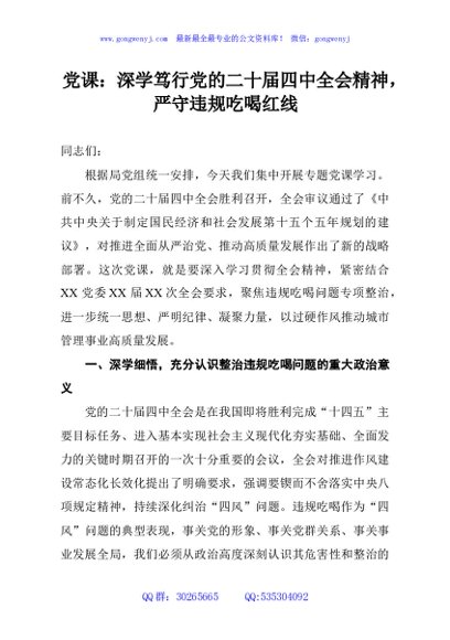 / 党课:深学笃行党的二十届四中全会精神,严守违规吃喝红线