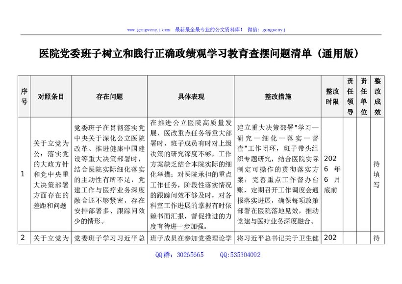 / 医院领导班子正确政绩观学习教育对照查摆问题清单(四大方面16个对照)