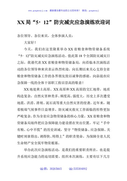 / XX局“5 12”防灾减灾应急演练欢迎词