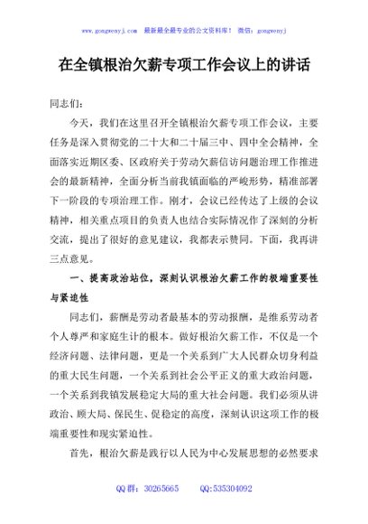 / 在全镇根治欠薪专项工作会议上的讲话