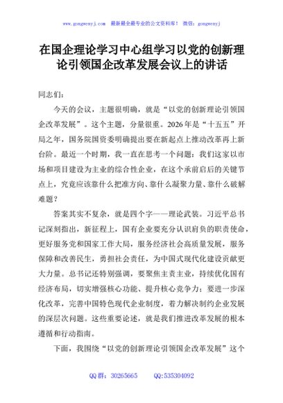 / 在国企理论学习中心组学习以党的创新理论引领国企改革发展会议上的讲话