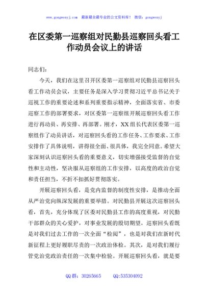 / 在区委第一巡察组对民勤县巡察回头看工作动员会议上的讲话