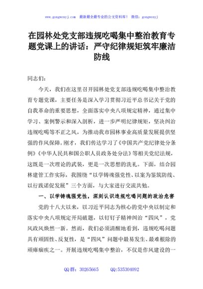 / 在园林处党支部违规吃喝集中整治教育专题党课上的讲话:严守纪律规矩筑牢廉洁防线