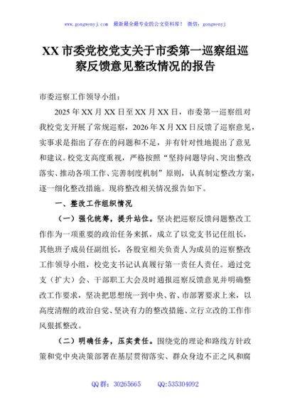 / XX市委党校党支关于市委第一巡察组巡察反馈意见整改情况的报告