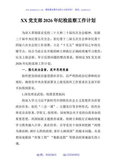 / XX党支部2026年纪检监察工作计划