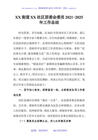 / XX街道XX社区居委会委员2021-2025年工作总结