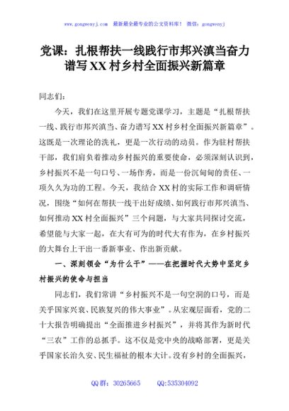 / 党课:扎根帮扶一线践行市邦兴滇当奋力谱写XX村乡村全面振兴新篇章