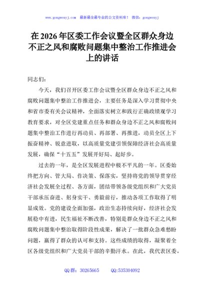 / 在2026年区委工作会议暨全区群众身边不正之风和腐败问题集中整治工作推进会上的讲话