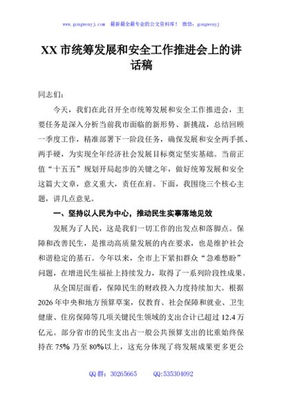 / XX市统筹发展和安全工作推进会上的讲话稿