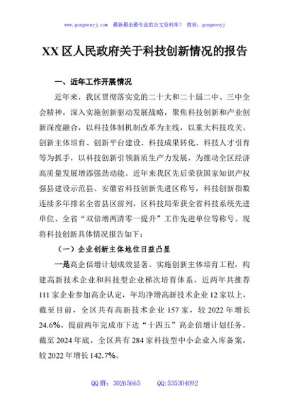 / XX区人民政府关于科技创新情况的报告