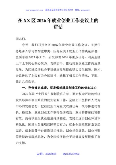 / 在XX区2026年就业创业工作会议上的讲话