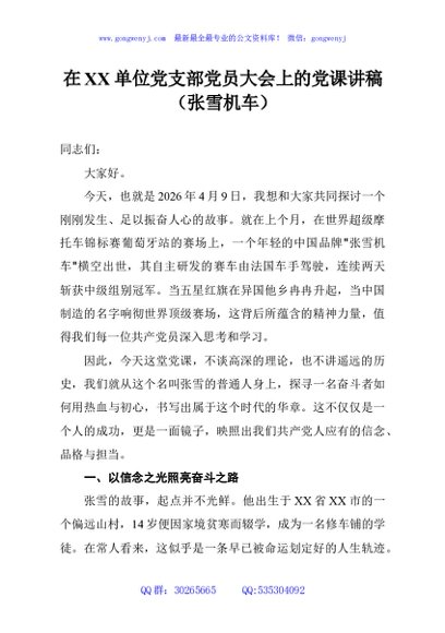 / 在XX单位党支部党员大会上的党课讲稿(张雪机车)