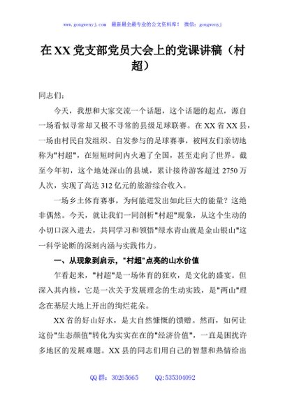 / 在XX党支部党员大会上的党课讲稿(村超)