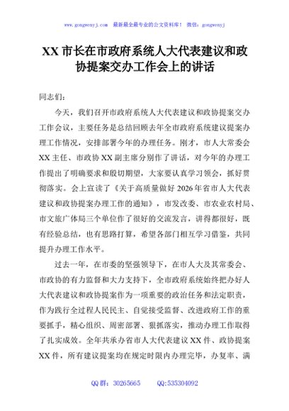 / XX市长在市政府系统人大代表建议和政协提案交办工作会上的讲话