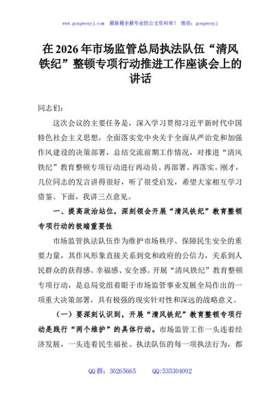/ 在2026年市场监管总局执法队伍“清风铁纪”整顿专项行动推进工作座谈会上的讲话