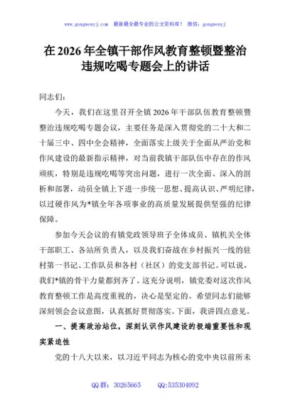 / 在2026年全镇干部作风教育整顿暨整治违规吃喝专题会上的讲话